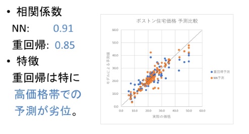 ボストン住宅価格予想における、ニューラルネットワークと重回帰分析の比較。